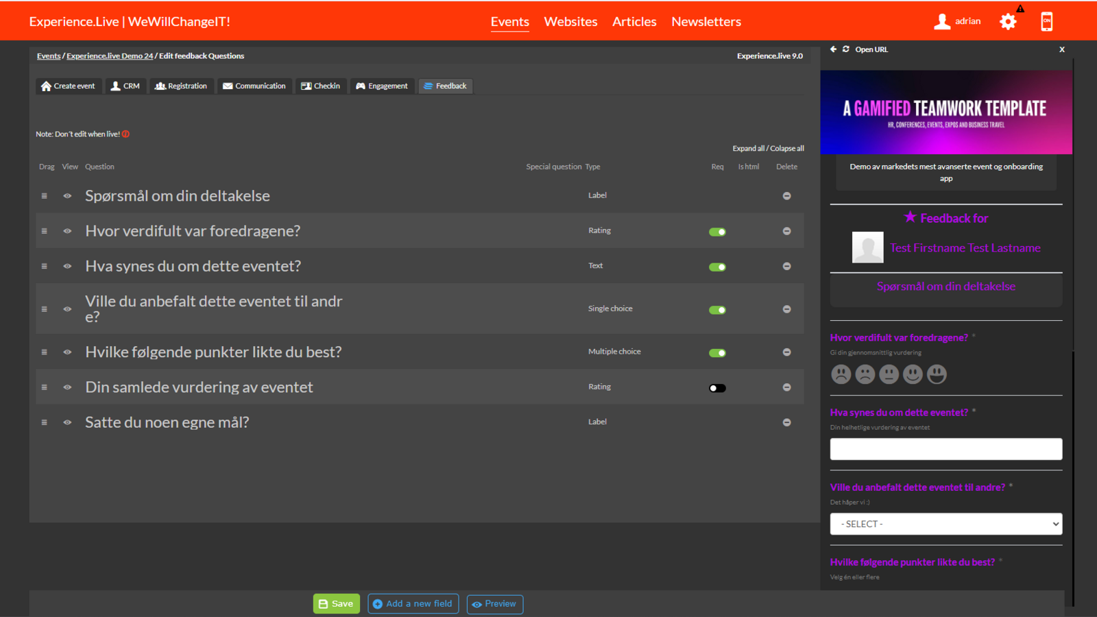 8. New questions - you can add more question fields to your feedback event
